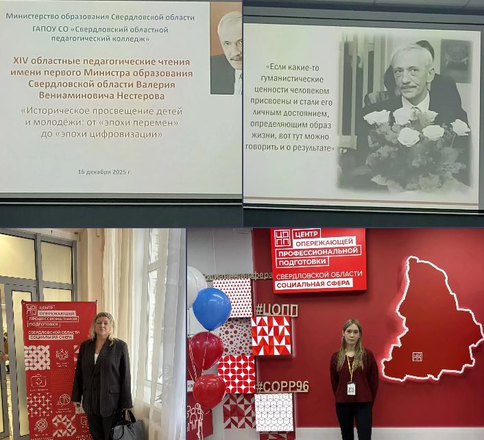 1) Четырнадцатые областные педагогические чтения имени первого министра образования Свердловской области Валерия Вениаминовича Нестерова «Историческое просвещение детей и молодёжи: от «эпохи перемен» до «эпохи цифровизации» принимала участие в работе секции заместитель директора колледжа Зырянова Елена Анатольевна на базе Центра опережающей профессиональной подготовки по направлению «Социальная сфера»;